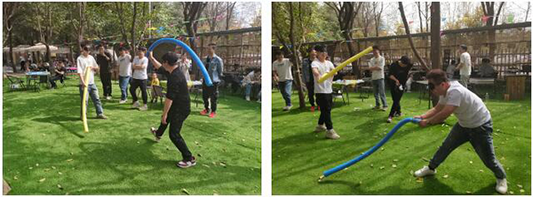 第二个游戏是东西南北跑,每组各选出2名组员分别背对背站在彩虹圈内,将乒乓球分别放置在4人对应方位的3-4倍距离,将彩虹圈放在腰间奋力拉动彩虹圈,最先拿到物品的组获胜本轮。共计玩3轮,取2胜为最终获胜。该游戏不光要靠力量牵制对手,更需要团队成员间的配合跟策略才能取得最终的胜利。本场游戏鲲鹏组顺利获得不断地沟通与及时调整策略取得了最终胜利。